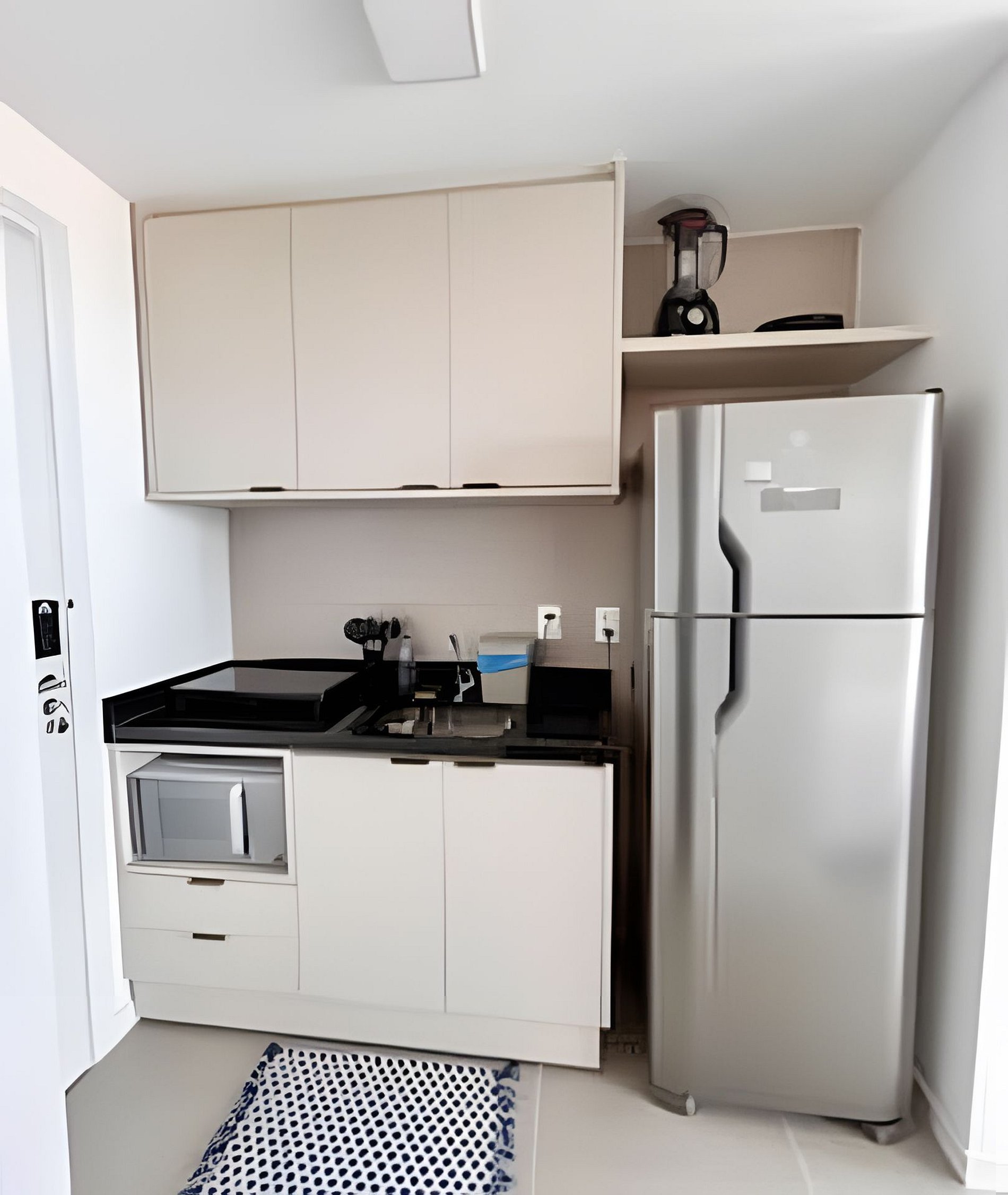 COZINHA COMPLETA: Cooktop de indução (2 bocas), forno elétrico e micro-ondas. Liquidificador, sanduicheira, cafeteira elétrica e Nespresso. Utensílios de cozinha variados (panelas, talheres, taças, copos, etc.). Itens básicos de limpeza (detergente, esponja nova, lixeira e pequena escada).